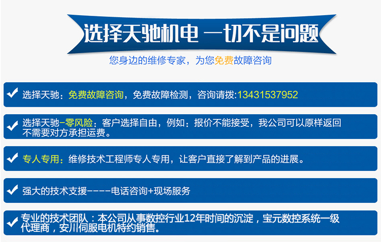 东莞市天驰机电设备有限公司是宝元数控系统一级代理商、安川伺服电机特约经销售、主要销售宝元数控系统、安川伺服电机、自产对刀仪、手轮。本公司数控行业10年时间的沉淀,拥有一支专业强大的售后服务和维修技术团队,可确保您购买我公司的产品第一时间得到技术服务和检测报价维修。在安川伺服、宝元数控系统和自动对刀仪有很好的价格优势外,在维修方面拥有专业的设备检测仪器,专业的维修工程师,大量的配件库存,为工业生产设备的维修保养,特别是设备出现故障现场快速抢修,为客户节省了大量的时间成本,缩短了停产周期,提高了生产效率,避免了不必要的损失。目前已和多家企业签订了长期合作协议,是多家大型企业的长期合作伙伴。